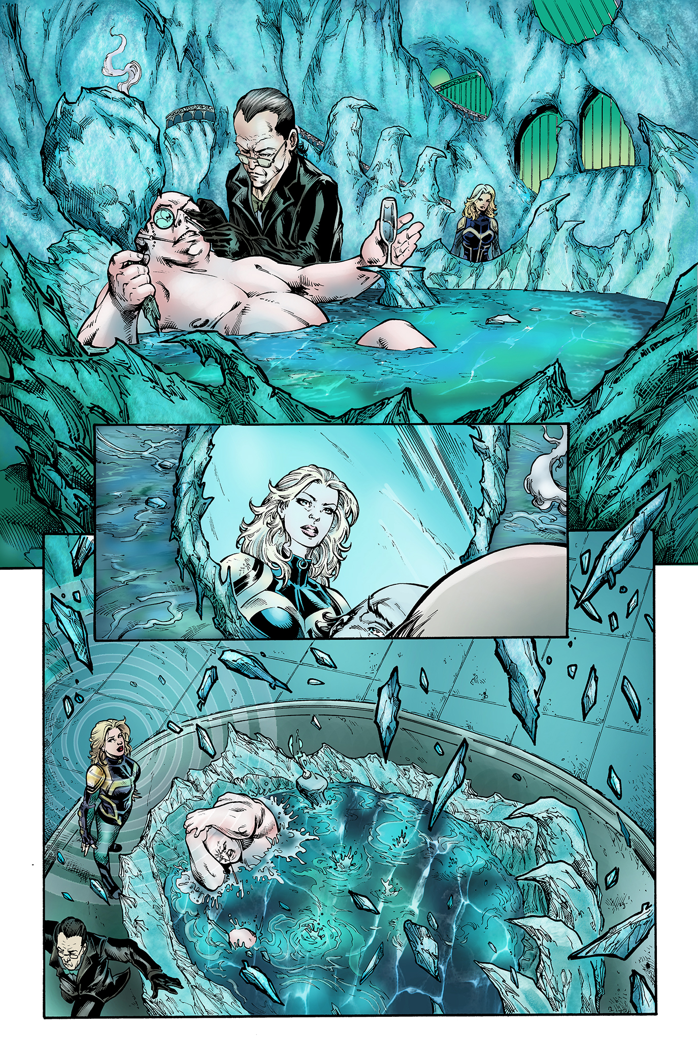 The latest page as of 9/16/15. This was a tough page to color by the coloring is getting easier. There was so much Ice. But inside the mirror I used a technique taught by Chris Sotomayor in the advanced coloring class at the comics experience. On a separate layer I created a haze with a paler blue. The periwinkle cooled the glass and helped it blend backward in the space.